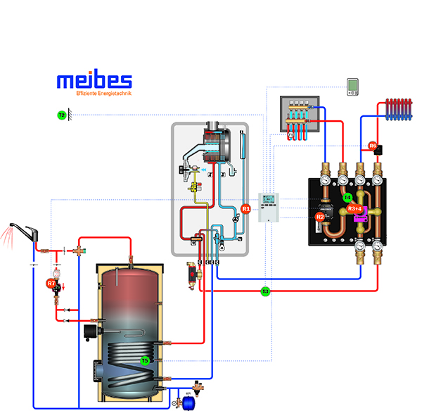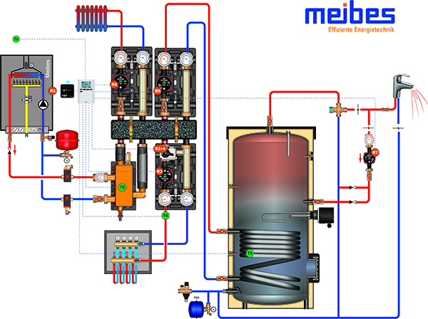 Система теплоснабжения мощностью максимум до 50 кВт с газовым конденсационным котлом и отопительными контурами радиаторного отопления и контуром теплых полов. Обвязка построена на смесительном блоке нового поколения RendeMIX, который позволяет котлу работать в любом режиме с обраткой минимальной температуры и соответственно с максимально возможным КПД, то есть с минимальным потреблением газа.