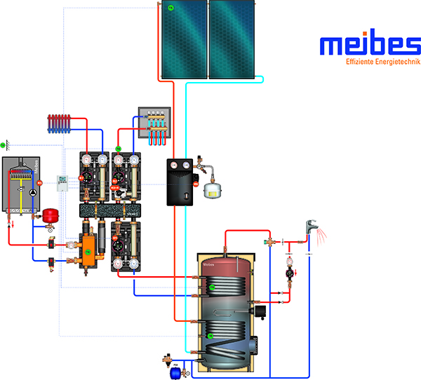 Котельная идентичная первому варианту, отличие в поддержке нагрева горячей воды двумя плоскими солнечными коллекторами FKF которые позволяют нагревать до 300 литров горячей воды за один день в бивалентном бойлере ESS-PU . Солнечные коллекторы обеспечивают самостоятельный нагрев горячей воды в межсезонье и летом, система позволяет на 80% ежегодно закрывать нагрев горячей воды за счет энергии солнца, экономя при этом до 500 куб. метров природного газа ежегодно и увеличивая срок службы газового котла, за счет уменьшения часов его работы. Электронный регулятор Meitronic W20 который управляет солнечной насосной станции М 3/4 имеет функцию обратного выхлаждения и защиты солнечных коллекторов от закипания, которые работают по принципу выброса из емкости избытка тепла в ночное время в реверсном режиме, для того что бы иметь возможность принять энергию солнца на следующий день.