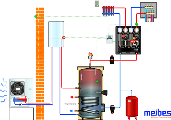 Котельная с тепловым насосом типа Воздух-Вода который работает на покрытие нагрузки радиаторного отопления и теплых половгидравлично реализованных через насосносмесительный блок KombiMIX. Потребители работают под управлением погодозависимого контроллера Meitronic W10, который управляет тепловым насосом по шине 0-10В.