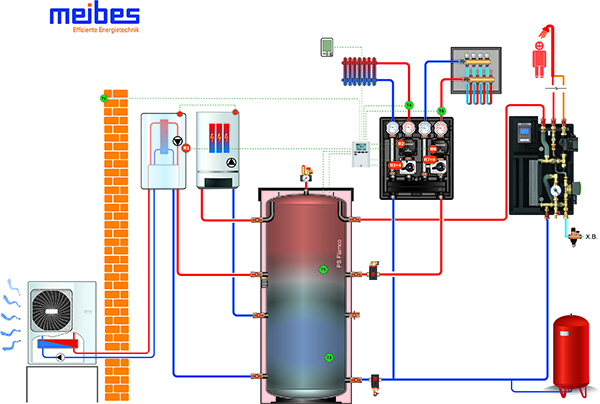 Котельная с тепловым насосом типа воздух-вода до заданной точки бивалентности и электрокотлом как пиковым источником при морозах под управлением контроллера Meitrinic W20. Теплогенераторы работают на покрытие нагрузки радиаторного отопления и теплого пола, реализованного через блок KombiMix и систему проточного приготовления горячей воды станцией LogoFreash. Буферная емкость аккумулирует тепловую энергию для покрытия нагрузки как системы отопления так и ГВС.